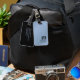 Modern utformning av bagagetaggar med fet monogram, struktur blå och svart bakgrund.