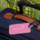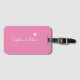 En elegant och professionell Rosa bagage-märkre med fält för namn (Sacramento-skriptet font-stil) på framsidan och ytterligare information på baksidan.. för att identifiera sak i stil.