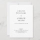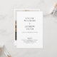 Bröllopbjudan har en minimalistisk och elegant utformning med en ren, vit bakgrund. Texten är placerad i en centrerad layout med ett klassiskt serif-teckensnitt för namn och ett sans-serif-teckensnitt för mindre detaljer. Parets namn visas på en framträdande plats i det stora brev som skapar en slående brännpunkt. Nedan justeras texten på ett bra sätt, så att evenemangsdetaljer finns i ett enkelt och modernt stil. Diskret mellanrum och justering gör att utformningen blir ett mejeriskt och sofistikerat drag, kompletterat med användan av svart typografi för en tidlös monokrom palett.