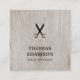 Minimalistisk anpassningsbar företags kort mall med träbakgrund och svart sax. Modern elegant design, perfekt för frisör, hårfrisör, barberare