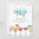 Cocktailtid. Bjud in dina vänner och släktingar på drinkar med detta söta och fantasifulla inbjudningskort. Med fantasifulla vinglas, paraplyer, citroner och limefrukter. Perfekt för födelsedagar, årsdagar, kontorsfester eller vilken tillställning som helst. Finns i lila, blå, orange och rosa färgschema.