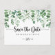 Detta minimalistiska eukalyptus horisontella spara datum-kort är perfekt för ett rustikt bröllop. Designen har handmålad akvarellgrön eukalyptus som inspirerar till naturlig skönhet.