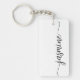 Flickigt enkel minimalistisk svart-vit monogramnamn skript anpassad personlig nyckelring. Dessa mönster har ditt förnamn i en snygg handskriven stilisert svans typsnittsunderskrift typografi svart skript på vit bakgrund. Dessa är lätta att anpassa. Snygg feminin husvärmegåva, även till födelsedag, mors dag, bröllop, brudshow, sweet 16 födelsedagsfest, baby shower, till examensfest och den är till flickan som älskar unika snygga saker.