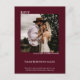Det här vykortet gör det enkelt för dina gäster att svara på din bröllopsinbjudan. Har en enkel minimalistisk design med ditt foto på en burgundisk eller vin röd bakgrund. På baksidan finns det utrymme för gästerna att visa sitt godkännande eller skicka beklaganden och välja vilken måltid de vill ha. Det finns även utrymme för en URL till en webben så att dina gäster kan svara på online om de så önskar.