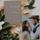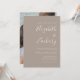 Den här enkla moderna bröllopsinbjudan innehåller vit text på en taupbakgrund. Lägg till bildens och bildens namn i snyggtens handskriftsgrafi och detaljerna i sans serif-teckensnitt. Byt enkelt ut exempelbilden på baksidan mot ett eget foto.