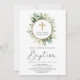 Fira ditt barns baptism med denna elegant botaniska temainbjudning med elegant vattenfärgseukalyptus greeneri i grönt och guld