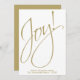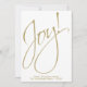 Det vackra julkortet säger allt i ett enkelt ord: Joy! Kortet har en minimal utformning med vit bakgrund och ord "Joy!" i guld. Texten är en modern manustypografi med faux glitter avslutat. Det finns utrymme för skriva Glad helg eller andra kort hälsning tillsammans med er namnteckning. Unikt sätt att skicka säsongens hälsningar.