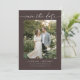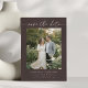 Denna spara-datum-kort har ett förlovningsfoto som är inramat av elegant handskriven text på en rik mokkabrun bakgrund. Den rena, moderna layouten framhäver ditt foto medan tillkännagivandet förblir tidlöst och romantiskt. Baksidan innehåller en QR-kod så att gästerna enkelt kan besöka er bröllopswebbplats för detaljer och information om firandet. Anpassa namn, datum och plats för att dela er bröllopsplan med vänner och familj.
