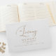 Minimalistiskt "In Loving Memory" firande i livet, begravningsgäst bok, elegant, underbart handskriftsteckensnitt, svart och vitt.