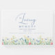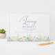Minimalistiskt "In Loving Memory" firande av livet, vit begravningsgäst bok, elegant, underbart handskriftsteckensnitt och vissnblommor.