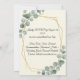 Inbjudan till elegant bröllop med minimalistiska vattenfärgseukalyptus löv och ett guld-geometriskt ram på en gräddbakgrund. Perfekt för modernt bröllop, möhippor eller förlovningsfester.