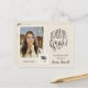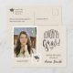 Detta är ett enkelt modernt examensmeddelande i vykortsformat med neutrala färger och en touch av lekfullhet. Du kan ersätta fotot med ett eget och lägga till ett personligt meddelande på baksidan av kortet.