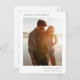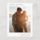 Ett minsta bildvykort med snyggt helgdag med klassisk typografi "God jul" i svart på en ren, enkel, minimalistisk vit bakgrund. Foto, Julhälsningar och text kan enkelt anpassas för personlig beröring. En enkel, minimalistisk och contemporary julklapp som utmärker den här julhelgen! Bilden som visas är avsedd att illustreras och ersättas med ett eget foto. Platshållarbilden består av ett par som går på stranden med en solnedgång.