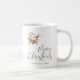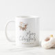 En minimalistisk jul mugg med en känslig vattenfärgad illustration av en bomullsbukett med pinekoner, bär och en omsluten gåva. Eleganten "God jul" hälsning i handskriven typografi i stil ger en personlig och festlig beröring.