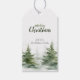 En julklapp med en minimalistisk utformning med en vattenfärgad illustration av evergreen träd vid grund, som återges i skuggor av skoglig grönt, oliv grönt och lätt grått, och som skapar ett gott vinterlandskap. Träd är avbildat med mjukt struktur och olika toner och lägger till djup och dimension i scenen. Snöflingor hör försiktigt till grenar och förbättrar vintriden. Bakgrunden är helt vit och ger ett rent och oklanderligt utseende som betonar det centrala inslagen. Utformningen är en lugn- och firandestämning som lämpar sig för att uttrycka säsong hälsning.