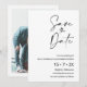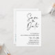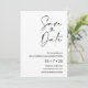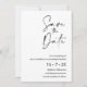 Minimalistisk kalligrafi bröllop spara datum kort med en modern kalligrafi bild och svart text. Detta enkla bröllop spara datum kort har också parets foto inom en vit ram, på baksidan av kortet.