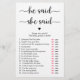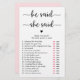 Dessa bedårande Han sa Hon sa spelkort är en rolig aktivitet för bröllopsfesten. Dela bara ut dem under festen där gästerna får gissa vem som sa varje påstående, den blivande bruden eller brudgummen.