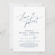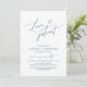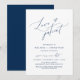 Detta är bröllopspartaj-inbjudan Uppdaterad (uppskjuten / uppskjutande) kort (Kärlek är tålamodig), ändra datumkort, i modern minimalistisk romantisk enkel ren design marinblå tema. Det är det perfekta sättet att meddela om ändring av evenemanget (spara vårt nya datum) till dina vänner och familj.