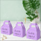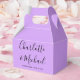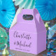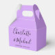Elegant bröllopspresentförpackning med chic signatur skript namn och speciellt datum på en lila lavendel bakgrund. Du kan anpassa med ditt eget tackmeddelande på baksidan. Ett perfekt sätt att tacka dina gäster! Designad av Thisisnotme©
