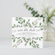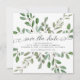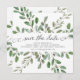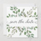 Detta trendiga bröllop save the date-kort har en ram av frodiga akvarellgröna blad och några små bär på en ren vit bakgrund. Baksidan av inbjudan säger också "Spara datum" i elegant kalligrafi. Perfekt för ditt kommande eleganta, minimalistiska bröllop.