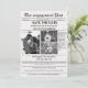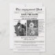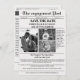 Minimalistisk manusdagstidning bröllop spara datum med tre foto, foto av brudgummen och bruden när de var barn och när de växte upp.