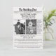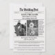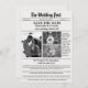 Minimalistisk manusdagstidning bröllop spara datum med tre foto, foto av brudgummen och bruden när de var barn och när de växte upp.