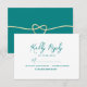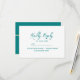 Minimalistisk, modern vit och teal bröllopsvarukort med guldbåg hjärta på baksidan och enkel handskriven kalligrafi.