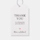 Elegant enkel och modern tacksamhetspresent bröllopsetikett som säger tack i svart teckensnitt med röd dekorativt hjärta.