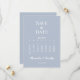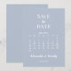 Minimalistisk och modern save the date-kort med kalender. Vacker dammtorr blå/pulverblå färg. Anpassa kalender, ändra typsnitt, typsnittsfärger, bakgrundsfärg. Redigera i designverktyg för att flytta det hjärta som ramar in numret för ditt datum. Skicka save the dates till dina gäster i förväg så att de sparar din stora dag.