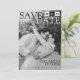 Elegant, modern, minimalistisk design för bröllopsinbjudan med 'Save the Date'. Vänligen anpassa texten, i redigeringsläge kan du ytterligare ändra enligt dina önskemål. Svart och vitt platshållarbild ska ersättas med din egen. Baksidan hänvisar till att kontrollera brölloppswebbplatsen, så vänligen ändra till din egen webbplats, där du kan inkludera mer detaljer och information.