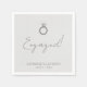 Förlovningsfest blöjor i en minimalistisk grått-typografi. Förlovning ring och ord "förlovad!" över napkin i ett skript och meddelandet "Grattisar" under. Anpassa med parets namn.