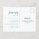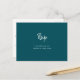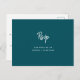 Dessa eleganta, minimalistiska bröllopssvarspostkort har modern skripttypografi och ren, sans-serif-text för en enkel och stilren djup teal och vit design som du kommer att älska. Det finns utrymme att lägga till dina gästers alternativ för måltidsval av entré eller middagsval. Texten hålls borta från de övre och nedre kanterna på baksidan av postkortet för att minska risken för att den täcks på topp och botten av postmärken.