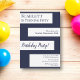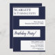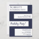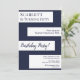 Denna eleganta navyblå och vita födelsedagsinbjudan är perfekt för en modern födelsedag. den enkla designen har elegant navyblå kalligrafi på vita ränder på en navyblå bakgrund.