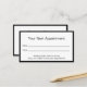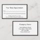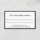 Detta minimalistiska visitkort för affärstidsanställning är dubbla-sidigt. Båda sidor har en elegant svart gräns. Sida ett säger "Ditt nästa Möte" och har linjer för datum och tid för det möte. I grund finns det visning som du kan redigera för att skapa ett anpassningsbar-meddelande om du vill. (Visas: Var vänlig och meddela 24 timmar i förväg om det inte går att behålla din möte.) Sida två har visning som ska ersättas med företaget namn och dess adress, mobilt nummer och webbplats. All text kan redigeras eller tas bort. Texten är svart.