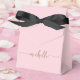 Elegant Modern Minimalistisk Guld Monogram Namn-skript Namnteckning Anpassningsbar Personlig Rosa Favor Box. Med första namn i en söt hand med text för kalligrafi (eller typografi) av svan-typsteckensnitt i guld på rosa eller baby rosa färg bakgrund. De här snyggtarna är giftiga feminina presentboxar underbara för utlämning, gåvor, gästgåvor och behandlingar under en kommande födelsedagsfest, BBQ, söt 16-årsdag, babydusch, bröllopsmottagning, bachelorette-fest, möhippa, årsdag och så vidare.