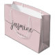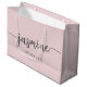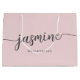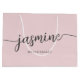Girly Minimalist Simple Clean Rosa Monogram Namn Namnteckning Personlig Gift Bag-för skriptAnpassningsbar. Den här designen som innehåller ditt första namn i ett söt-handsbokstäver i svan-stil namnteckning typografi (eller kalligrafi) med texten "BRIDESMAID" på dammig rosa eller pastellljusbakgrund för rosa. Dessa är lätta att anpassa. Den här feminina presentsäcken, underbart tillbehör till möhippa, bröllop, till ett bridesmaid-frieri- eller bachelorette-parti och det är till den flicka som kärlek unika minimalistiska sak.