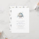 Minimalistisk Watercolor Rocket Spaceship Boy's Party Birthday-inbjudan i blått och grått. Baksidan har en mönster i vattenfärgsillustrationer för blanksteg.