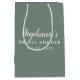 Den sagegröna och vita bröllopsduschgåvan påse ger en touch av elegans med sin mjuka sagegröna färg och rena vita text. Denna minimalistiska design håller det enkelt men ändå stilrent, vilket gör den till ett perfekt val för att presentera gåvor på en bröllopsdusch. Den diskreta estetiken låter budskapet lysa igenom, samtidigt som den lägger till en personlig touch med fraser som "Bröllopsdusch" eller brudens namn. Ett praktiskt och chic sätt att slå in dina genomtänkta gåvor, erbjuder denna påse en sofistikerad och tidlös look för det speciella tillfället.