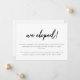 Minimalistisk svart & vit skript bröllopsflykt tillkännagivande. Anpassa med ditt meddelande om bröllopsflykt för familj och vänner på framsidan och lägg till brud och brudgums initialer på baksidan av kortet.