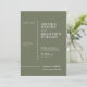 Denna minimalistiska typografi Sage Green bröllopsinbjudan är den perfekta inbjudan att skicka dina gäster för att fira din speciella dag. Den enkla och minimalistiska designen kompletterar alla par. Klicka för att anpassa ytterligare för textplacering och redigeringsverktyg för fullständig färganpassning.