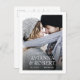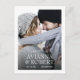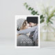 Den här minimalisten Spara vykortet för datum börjar med ditt pars foto. Det första namnen är skrivet i ett stort elegant vitt serif-teckensnitt. Spara datumet i en böjd snyggt som skrivs ovan. Datum och plats för bröllop är nedan. Din returadress är förtryckt på baksidan och det finns utrymme för ytterligare ett meddelande.