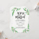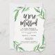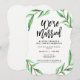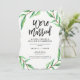 Dessa moderna, minimalistiska brölloppsinbjudningar efter vigseln har en ren vit bakgrund med gröna akvarellblad och svart typografi.