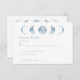 Fyll i ditt himmelska bröllopssvit med vårt minimalistiska svarskort i Celestial Blue Collection med månfaser. Denna design har en enkel, minimalistisk och skarp estetik, med en ren vit bakgrund som låter de himmelska elementen sticka ut. I mitten längst upp på kortet visas de fem månfaserna i en vacker ljusblå färg, vilket ger en touch av himmelskt skönhet till designen.