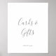 Denna minimalistiska skylt med silverkort och gåvor är perfekt för ett enkelt bröllop eller brudvisning. Den moderna romantiska designen har klassisk silvergrå och vit typografi i kombination med en rustik men elegant kalligrafi med vintage handstilsstil. Kan anpassas i valfri färg. Håll designen enkel och elegant, som den är, eller anpassa den genom att lägga till din egen grafik och konst. Textraden längst ner på skylten kan anpassas med datumet, brudens och brudgummens namn eller ett kort meddelande som "Tack". Denna skylt kan användas för ett bröllop eller någon annan tillställning eller fest.