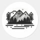 Ett minimalistiskt svart och vitt illustration av ett bergslandskap med boskapstoppar, gräs träd och ett stort fullt måne. Utformningen är enkel men ändå slående, med rent linjer och djärva former.