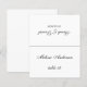 En minimalistisk svart-vit bröllopsplatshållare med gästens namn och bordnummer tryckt på framsidan och brud och brudgums namn samt bröllopsdatum tryckt på den andra sidan (det är den andra halvan innan den viks). All text är i svart kalligrafisk stil och bakgrunden är vit.