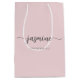 Girly Minimalist Simple Clean Rosa Monogram Namn Namnteckning Personlig Gift Bag-för skriptAnpassningsbar. Den här designen som innehåller ditt första namn i ett söt-handskrivet stil-bytesteckensnitt i svan namnteckning typografi (eller kalligrafi) med texten "BRIDESMAID" på dammig rosa eller pastellljusbakgrund för rosa. Dessa är lätta att anpassa. Den här feminina presentsäcken är underbart tillbehör till bröllop, möhippa, till ett bridesmaid-frieri- eller bachelorette-parti, och det är för flickan som kärlek är ett unikt minimalistiskt sak.