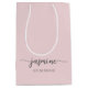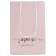 Girly Minimalist Simple Clean Rosa Monogram Namn Namnteckning Personlig Gift Bag-för skriptAnpassningsbar. Den här designen som innehåller ditt första namn i ett söt-handskrivet stil-bytesteckensnitt i svan namnteckning typografi (eller kalligrafi) med texten "BRIDESMAID" på dammig rosa eller pastellljusbakgrund för rosa. Dessa är lätta att anpassa. Den här feminina presentsäcken är underbart tillbehör till bröllop, möhippa, till ett bridesmaid-frieri- eller bachelorette-parti, och det är för flickan som kärlek är ett unikt minimalistiskt sak.