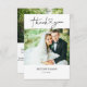 Minimalistiskt enkelt skript med Heart Bröllop Photo Tack Elegant You Card och ett enkelt bröllop tack för att du har ett dubbelsidigt kort med handskrivet skrivstil och text med ett hjärta mellan ord. Den här avslappnaden och det vita utrymmet ge är ett enkelt och minimalistiskt intryck. Standardmeddelandet på baksidan kan redigeras. En andra kvadrat bild kan läggas till på kortets baksida.