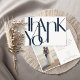 Vänligen uppvisa din hjärtliga uppskattning med dessa enkla 7-tums x 5-tums bröllop-tackkort med ord, "Tack," i stort marint blått brev mot vit bakgrund. Kortens baksida har en plats för ditt favoritfoto, ett litet hjärta tillsammans med meddelandet "med kärlek från det nya", en valfri meddelanderuta och en platshållare för det nya namnen.